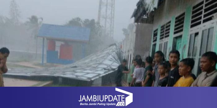JAMBIUPDATE.CO, MUARA BULIAN- Atap Asrama Santri Ma'had Darusy Syafiiyah, Kampung Pulau, Kecamatan Pemayung, roboh diterpa angin puting beliung, Senin (23/9) sore.