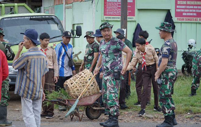 JAMBIUPDATE.CO, MUARO JAMBI- Setelah sebelumnya melaksanakan Karya Bhakti membersihkan tempat pemakaman umum (TPU) yang berada tidak jauh dari Makodim 042/Jambi di kawasan Puncak, Jelutung, Kota Jambi, Anggota TNI Kodim 0415/Jambi melaksanakan Bhakti Sosial di Kabupaten Muaro Jambi. Kegiatan Bhakti Sosial di Kabupaten Muaro Jambi menyasar pembersihan TPU Bumi Asih Sengeti, Pembersihan Pasar Sengeti, Pembersihan Sungai Batanghari, Pengecatan Tugu Juang Sengeti dan Pengecatan Pagar Masjid Istiqomah Sengeti. Kegiatan Bhakti Sosial Kodim 0415/Jambi bekerjasama dengan Pelajara yang tergabung dalam Organisasi Pramuka sebanyak 50 orang, Perwakilan OPD sebanyak 75 orang, Anggota Polres Muaro Jambi 20 orang, Staf Camat 20 orang, warga sekitar 60 orang dan Anggota TNI dari Kodim 0415/Jambi sebanyak 80 orang. Kegiatan ini juga dihadiri, Pabung Muaro Jambi, Mayor Inf Beni, S.I.P, Asisten III, Abdul Hamid, S.Pd, Asisten II, Dr. Ahmad Ridwan, S.H., MH, Kadis LH, Evi Syahrul, SP, Camat Sekernan, M. Iqbal, S.STP, ME, Kabag Umum Mahhali, Kabaghukum, Gartam Handaya, S.H., MH, Lurah Sengeti, Rahmat, S.Pd, Kasat Sabhara Polres Muaro Jambi dan Danramil Wilayah Muaro Jambi. Dandim 0415/Jambi Letkol Inf Yoga Cahya Prasetya melalui Pabung 0415/Jambi Mayor Inf Beni, S.I.P, mengatakan kegiatan ini telah sesuai dengan petunjuk tekhnis "Pak Dandim berpesan agar menggelar karya bhakti bersama masyarakat, polri, forkopimda dan sejumlah anak-anak pelajar. Untuk sasarannya seperti membersihkan sejumlah fasilitas umum di wilayahnya. Kita berharap apa yang dikerjakan ini dapat bermanfaat bagi masyarakat dan bisa menjadi ladang amal bagi kita,” tuturnya. Salah seorang masyarakat, Adi mengaku senang bisa bersinergi dengan TNI dalam karya bhakti ini. “TNI memang dari rakyat dan untuk rakyat. Semoga TNI semakin moderen dan jaya selalu,” tandasnya. Untuk diketahui, tema Karya Bhakti Kodim 0415/Jambi dalam rangka HUT ke-79 TNI, 5 Oktober 2024, adalah TNI Modern Bersama Rakyat Siap Mengawal Suksesi Kepemimpinan Nasional Untuk Indonesia Maju. (wan)