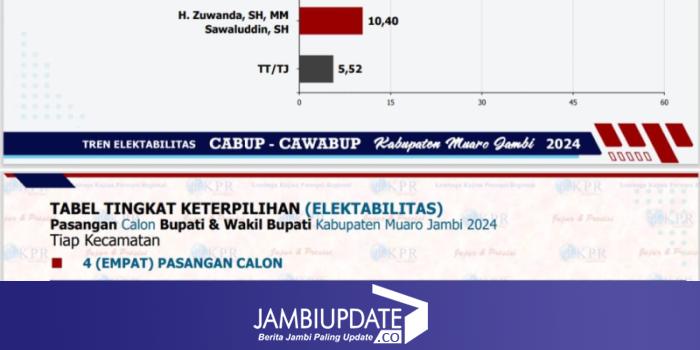 Pasangan Masnah Zulkifli paling unggul dengan elektabilitas 44, 19 persen. Jumlah tersebut mengalahkan Bambang Bayu - Jun Mahir di angka 29, 27 persen, sedangkan pasangan Asnawi Sentot 10,65 lalu kemudian diikuti Juwanda Syawaludin 10, 40 persen. Lalu ada 5,52 yang belum menjawab atau tidak tahu.