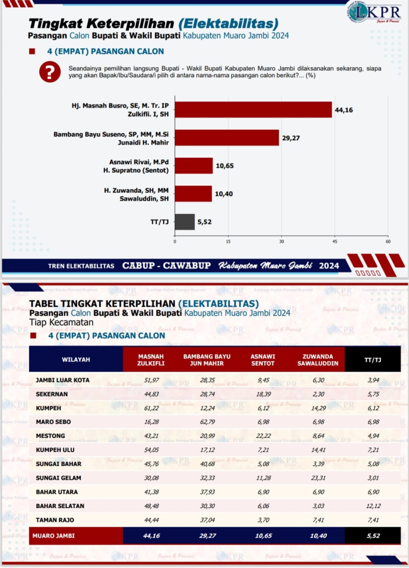 Kokohnya pasangan Masnah Zulkifli ini dinyatakan Direktur Eksekutif LKPR Dr. Noviardi Ferzi dalam rilisnya tentang Peta Elektoral calon Bupati dan Wakil Bupati Muaro Jambi (2/9), Rabu ini.
