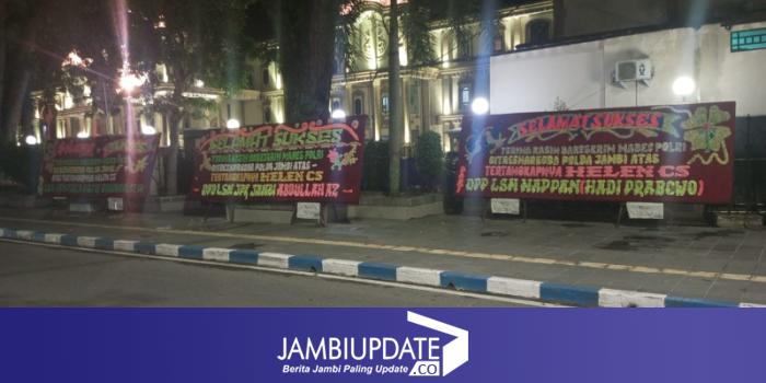 "Terimakasih Bareskrim Mabes Polri dan Ditresnarkoba Polda Jambi atas tertangkapnya Helen CS jaringan Ratu Narkoba Jambi ," tulis salah satu papan karangan bunga tersebut.