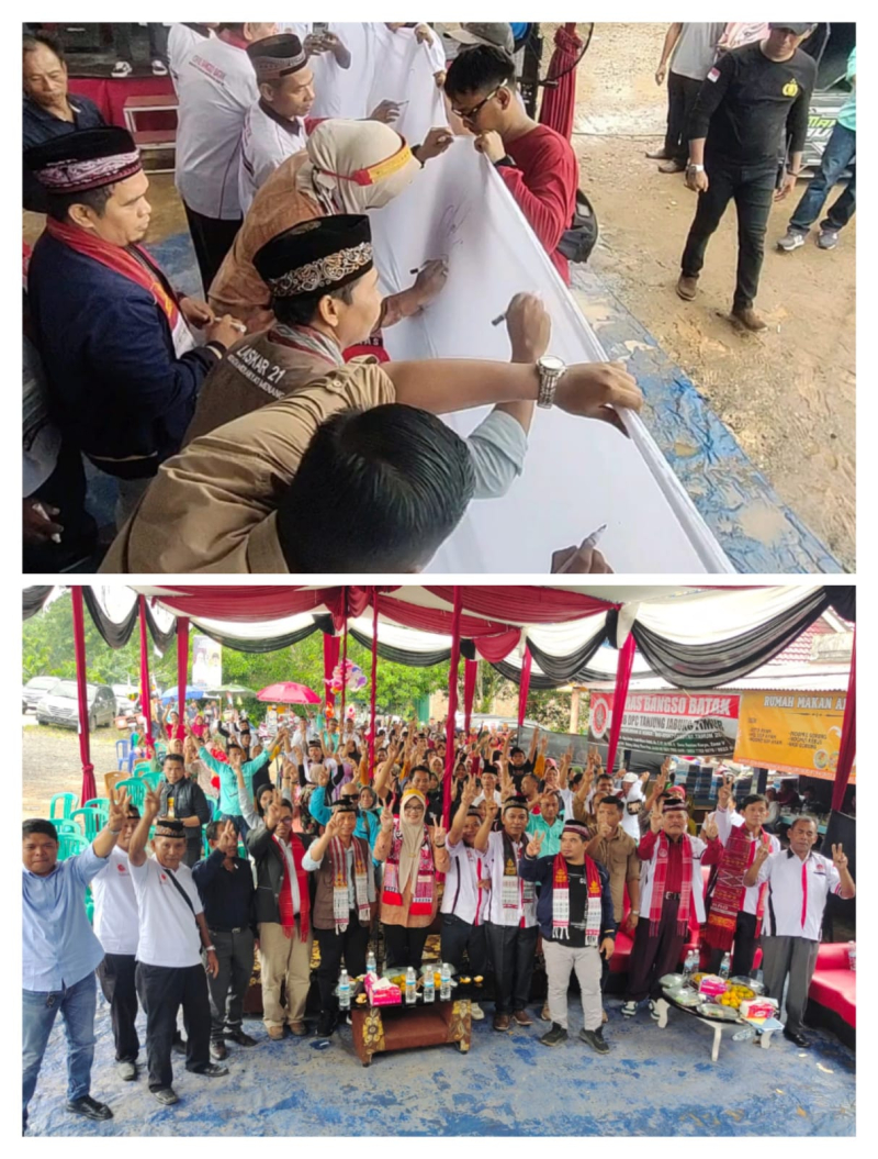 Penanda tanganan dimulai dari kandidat Cabup Dillah, juru kampanye Mahrup, pimpinan parpol koalisi pengusung, yang dilanjutkan Ketua dan fungsionaris HBB serta spontan diikuti oleh masyarakat sekitar. Ratusan pernyataan tersebut menjadi simbol kemenangan Dillah -Tanja dan Romi - Sudirman.(lan)