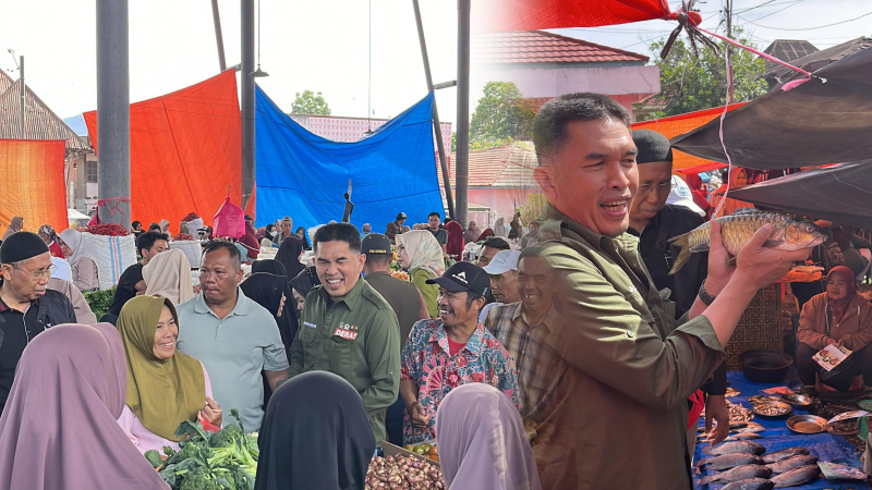 Cabup Dr Deri ke pasar menemui langsung pedagang untuk menyerap aspirasi masyarakat, terutama pedagang pasar. Terlihat para pedagang berkomunikasi dan menyampaikan beberapa aspirasi ke dokter Deri.