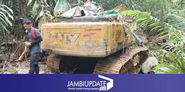 Selanjutnya, sekitar pukul 15.15 WIB tim melanjutkan perjalanan menelusuri aliran Sungai Batang Bungo, menelusuri bekas jalan yang diduga dilintasi alat berat, dan sekitar pukul 15.40 WIB pada titik koordinat -1,71134, 101,76032, 219,6m, 316° ditemukan 1 (satu) unit alat berat jenis excavator warna kuning Merk SANY tanpa dilengkapi komputer dan kunci yang ditutupi dengan tumpukan kayu dan ranting.