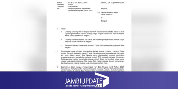 JAMBIUPDATE.CO, JAMBI - Dalam rangka memperingati Hari Bela Negara ke-76 Tahun 2024, Kementerian Pertahanan RI melalui Direktorat Jenderal Potensi Pertahanan selaku leading sektor di bidang Bela Negara akan menyelenggarakan penganugerahan Award Aksi Nyata Bela Negara Tahun 2024.