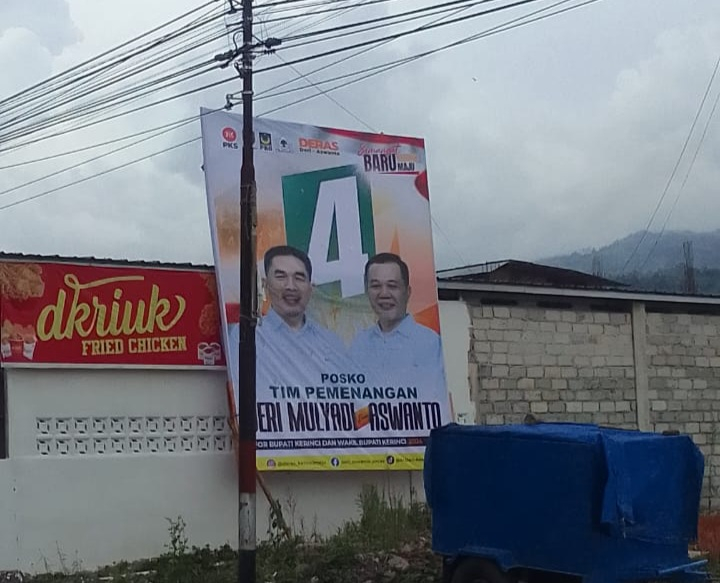 JAMBIUPDATE.CO, JAMBIKERINCI- Baliho paslon nomor 4 Deri Mulyadi-Aswanto (Deras) yang terpajang di kediaman mantan calon Bupati Kerinci Irmanto di Siulak, mendadak hilang. Informasi yang didapat dari tim pemenangan Deri-Aswanto di lapangan, Selasa (5/11/2024) baliho tersebut sebelumnya sempat dirusak oleh oknum tak bertanggung jawab.