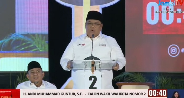 "Kami berdua keyakinan, warga Kota Jambi mengharapkan pemimpin yang membawa harapan dan pemimpin yang membawa perubahan. Untuk itu, saya hadir bersama Pak H Abdul Rahman mewujudkan itu dengan visi Jambi Maju Mandiri Prima kepada masyarakat," kata H Andi Muhammad Guntur saat debat.