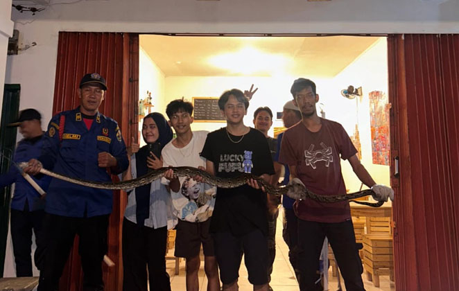 "Iya benar, ular tersebut masung melalui Dapur warung kopi tersebut. Panjang ular sekitar 300 Cm, saat menerima laporan dari warga, petugas Damkar Muaro Jambi langsung bergegas menuju ke lokasi dan langsung mengevakuasi ular tersebut," kata Herman Susilo.