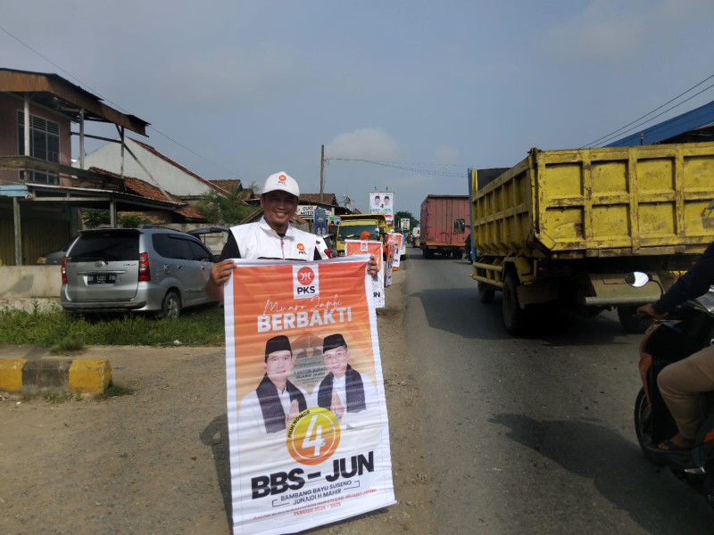Mereka mensosialisasikan calon Bupati dan Wakil Bupati Muaro Jambi nomor urut 4, Bambang Bayu Suseno (BBS) dan Junaidi H Mahir (Jun Mahir) dan Gubernur Jambi no Urut 2 Al Haris -Sani ke masyarakat.