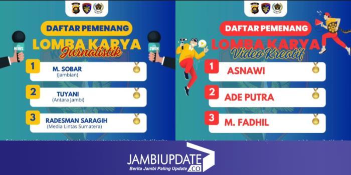 Untuk Juara 1 Karya Jurnalistik diraih oleh M.Sobar Alfahri (Jambian.id) dengan Karya berjudul 'Lika Liku Polairud Polda Jambi Menjaga Ketertiban dan Keamanan Jalur Sungai Yang Terpanjang di Sumatera'.