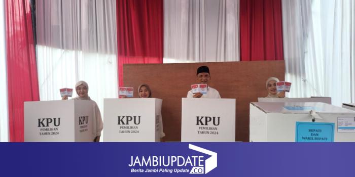 JAMBIUPDATE.CO, SAROLANGUN– Calon Bupati Sarolangun Nomor Urut 05 H. Hurmin, beserta istri Hj. Risha Fitria dan anak menggunakan hak suaranya di Pemilihan Kepala Daerah (Pilkada) Serentak tahun 2024, Rabu (27/11/2024) di TPS 03, Desa Panti, Kecamatan Sarolangun.