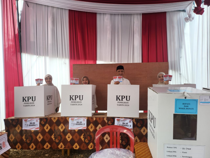 Sambil tersenyum, Calon Bupati Sarolangun nomor urut 05 Hurmin beserta istri Hj Risha Fitria dan anak tampak mengenakan baju putih secara kompak mendatangi TPS 03 Desa Panti, dan bersalaman dengan masyarakat yang juga datang ke TPS.