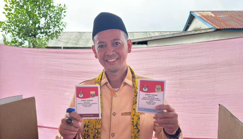 Muslimin Tanja menyalurkan hak suaranya di TPS 02 Desa Kota Harapan, Kecamatan Sabak Timur, Kabupaten Tanjabtim.