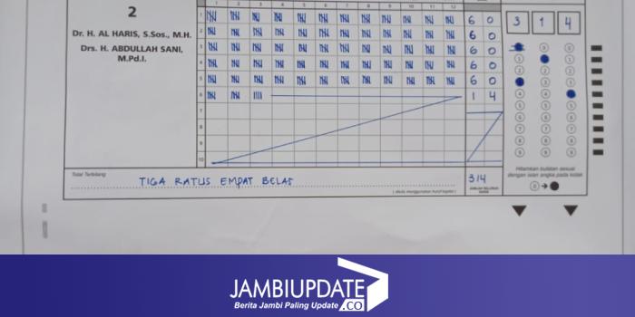 JAMBIUPDATE.CO, JAMBI - Penghitungan suara Pilgub Jambi tahun 2024 di TPS 09, RT 15 Kelurahan Talang Bakung Kecamatan Paal Merah, Kota Jambi rampung dilakukan.