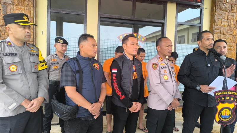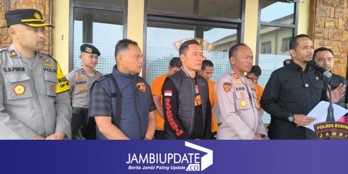 Direktur Diskrimun Brimob Polda Jambi Kombes Pol Andri Ananta Yudistira bersama Kapolres Kerinci AKBP Muhamad Mujib dan jajaran menyampaikan saat Pers Release pada Selasa 03 desember 2024 pagi, 5 tersangka telah ditahan di Rutan Mapolda Jambi, dan 4 tersangka yang menyerahkan diri dibawa ke Polda Jambi.