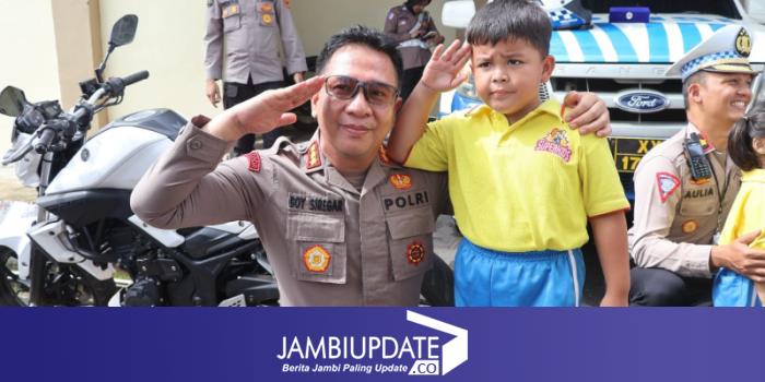Kunjungan KB Superkids Billingual tersebut disambut cinta kasih oleh Kapolresta Jambi Kombes Pol Boy Sutan Binanga Siregar didampingi Kasat Lantas Kompol Aulia Rahmad sebagai bentuk Polisi Sahabat Anak.