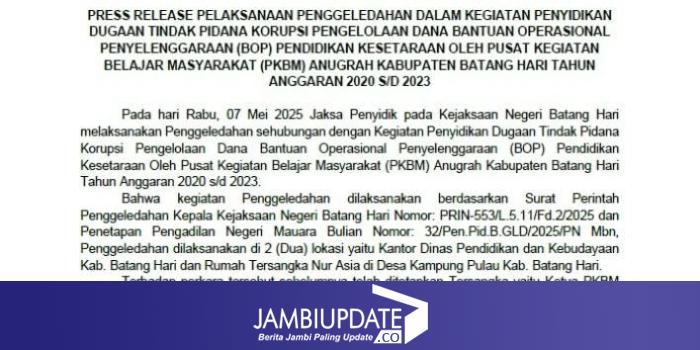 JAMBIUPDATE.CO, BATANGHARI - Kejaksaan Negeri Batanghari telah mengeluarkan Press Release terkait pelaksanaan penggeledahan dalam kegiatan penyidikan dugaan tindak pidana korupsi pengelolaan Dana Bantuan Operasional Penyelenggaraan (BOP) pendidikan kesetaraan oleh Pusat Kegiatan Belajar Masyarakat (PKBM) Anugrah Kabupaten Batanghari tahun anggaran 2020 - 2023.