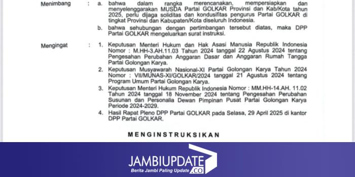 JAMBIUPDATE.CO, JAMBI- Dewan Pimpinan Pusat (DPP) Partai Golkar mengeluarkan intruksi jelang Musyawarah Daerah (Musda). Intruksi ini terkait larangan penunjukan pelaksana tugas (Plt) Ketua DPD Partai Golkar di tingkat kabupaten/kota.