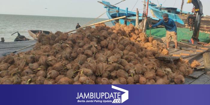 Aktivitas bongkar muat kelapa di Tanjabtim beberapa waktu lalu. Kini harga komoditas andalan Tanjabtim ini turun drastis.