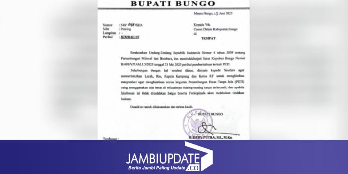 Surat bernomor 540/548/SDA tersebut merujuk pada Undang-Undang Republik Indonesia Nomor 4 Tahun 2009 tentang Pertambangan Mineral dan Batubara serta tindak lanjut atas surat Kapolres Bungo Nomor B/499/V/PAM.3.3/2025 tertanggal 21 Mei 2025 mengenai pemberitahuan aktivitas PETI.