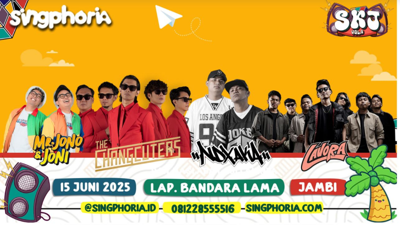 JAMBIUPDATE.CO, JAMBI - Pesta Musik Istimewa Singphoria SKJ (Semua Kangen Jambi) Volume 5 tinggal menghitung hari. Acara ini akan berlangsung di Lapangan Bandara Lama, Jambi pada Minggu, 15 Juni 2025 malam.