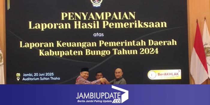 Laporan Hasil Pemeriksaan (LHP) BPK RI itu diterima oleh Bupati Bungo H. Dedy Putra didampingi Ketua DPRD Bungo dari Kepala BPK RI Perwakilan Jambi, Paula Henry Simatupang, di Auditorium Sultan Thaha, Kantor BPK Perwakilan Provinsi Jambi, Jumat (20/06/2025).