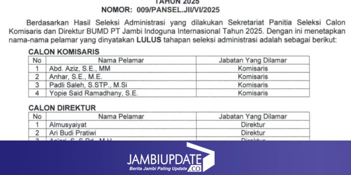 JAMBIUPDATE.CO, JAMBI - Panitia Seleksi Calon Komisaris dan Direktur BUMD milik Pemprov Jambi, PT.Jambi Indoguna Internasional (JII) mengumumkan pelamar yang lulus seleksi administrasi (tahap awal).