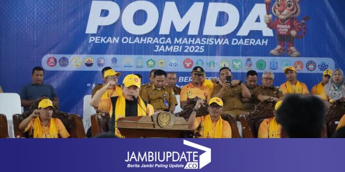 JAMBIUPDATE.CO, JAMBI - Gubernur Jambi Dr. H. Al Haris, S.Sos., M.H., membuka secara resmi Pekan Olahraga Mahasiswa Daerah (POMDA) Ke-19 Provinsi Jambi tahun 2025. Pembukaan ini ditandai dengan pemukulan gong sebagai tanda dibukanya acara secara resmi, bertempat di Balairung Universitas Jambi, Selasa (08/07/2025) pagi.