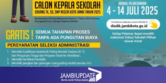 JAMBIUPDATE.CO, JAMBI — Pemerintah Kota Jambi resmi membuka seleksi terbuka calon Kepala Sekolah untuk jenjang SD, dan SMP Negeri tahun 2025. Seleksi ini diperuntukkan bagi guru ASN di lingkungan Kota Jambi dan dilaksanakan berdasarkan Permendikdasmen Nomor 7 Tahun 2025.
