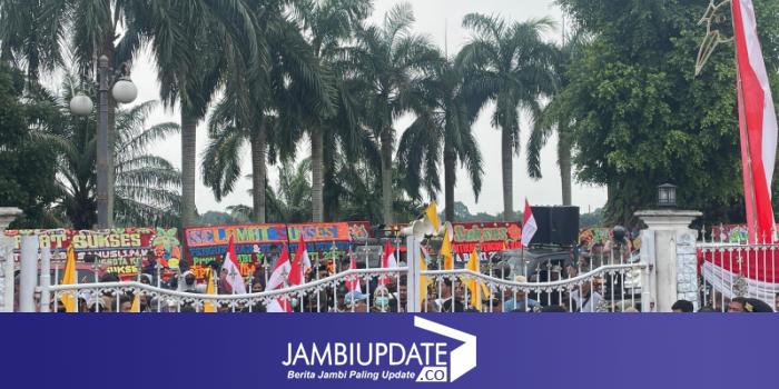 JAMBIUPDATE.CO, JAMBI - Massa Aliansi Keadilan Bersama Polri (AKBP) berunjuk rasa di rumah dinas Gubernur Jambi Jambi Senin (11/8/2025). Demo itu berlangsung sebelum pelantikan Ketua Koni Jambi terpilih 2025-2029 Mat Sanusi oleh Ketum Koni Pusat Marciano Norman.