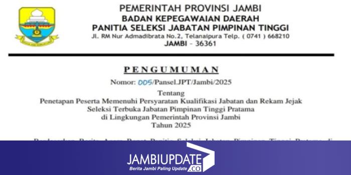 Hal ini tertuang dalam surat resmi pansel, Nomor: 005/Pansel.JPT/Jambi/2025 tentang Pendaftar seleksi terbuka yang dinyatakan memenuhi persyaratan, dan selanjutnya ditetapkan sebagai peserta seleksi terbuka berdasarkan nilai tertinggi pada setiap lowongan jabatan.