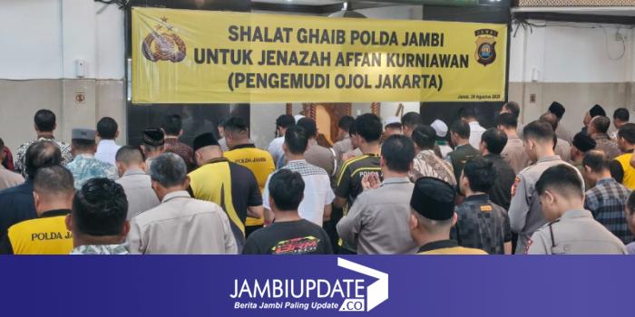 JAMBIUPDATE.CO, JAMBI - Polda Jambi menggelar Sholat Ghaib di Masjid Al-Ikhlas Polda Jambi usai pelaksanaan Sholat Jumat berjamaah, Jumat (29/8/25).