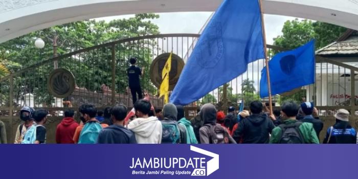 Massa yang berjumlah puluhan orang ini tertahan di pintu gerbang utama lantaran pintu ditutup. Tampak juga kendaraan opersional kepolisian terparkir di sekitaran pusat pemerintahan Pemprov dan DPRD Provinsi Jambi.