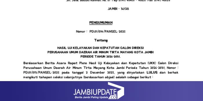 JAMBIUPDATE.CO, JAMBI – Tahapan seleksi Direksi Perumda Air Minum Tirta Mayang Kota Jambi periode 2026–2031 memasuki babak penting. Pemerintah Kota Jambi resmi mengumumkan 10 nama yang berhasil lolos Uji Kelayakan dan Kepatutan (UKK), berdasarkan Berita Acara Rapat Pleno Nomor PD.01/013/PANSEL-2025 tanggal 2 Desember 2025.