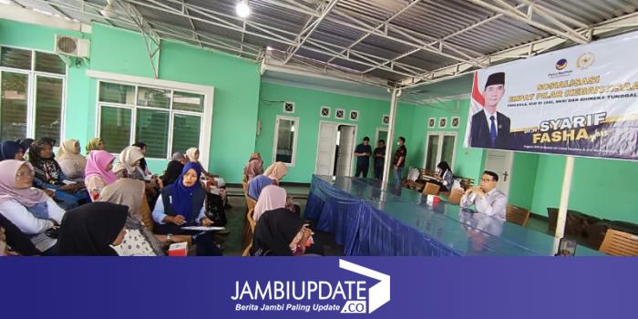 JAMBIUPDATE.CO, JAMBI-Anggota DPR/MPR dari Fraksi NasDem Dr H Syarif Fasha ME, menggelar sosialisasi 4 pilar bersama masyarakat Jambi Senin 15 Desember 2025 di Rumah Apirasi Syarif Fasha di Telanai Pura, Kota Jambi.