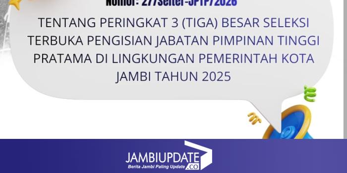 JAMBIUPDATE.CO, JAMBI – Pemerintah Kota (Pemkot) Jambi resmi mengumumkan hasil seleksi terbuka pengisian Jabatan Pimpinan Tinggi (JPT) Pratama atau jabatan Eselon II di lingkungan Pemkot Jambi Tahun 2025.