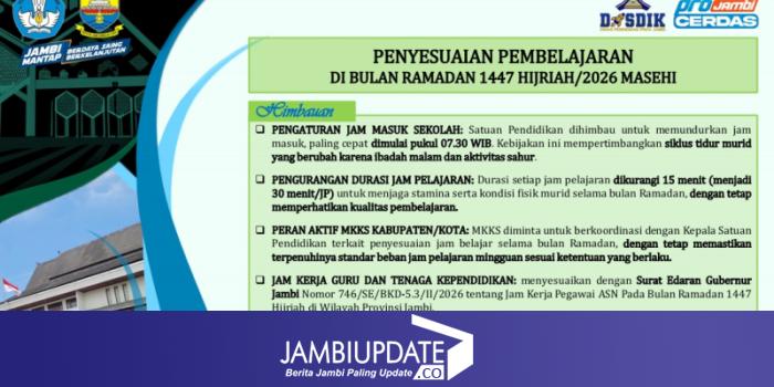 Dinas Pendidikan Provinsi Jambi mengimbau seluruh satuan pendidikan agar memundurkan jam masuk sekolah. Proses belajar mengajar paling cepat dimulai pukul 07.30 WIB, menyesuaikan kondisi peserta didik yang menjalankan ibadah malam dan sahur.