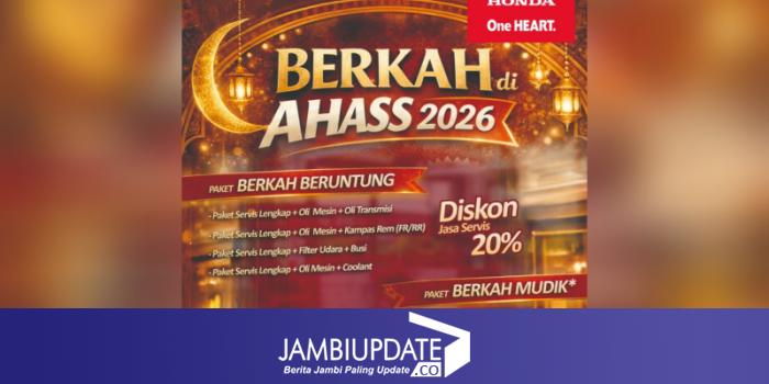 JAMBIUPDATE.CO, JAMBI – Menyambut Mudik Lebaran 2026, PT Sinar Sentosa Primatama (Sinsen), Main Dealer Sepeda Motor Honda di Provinsi Jambi, kembali menghadirkan program spesial bertajuk “BERKAH di AHASS 2026”. Program ini memberikan diskon jasa servis hingga 30% dan berbagai paket servis hemat yang dapat dinikmati konsumen di seluruh jaringan AHASS mulai tanggal 23 Februari hingga 8 Maret 2026.