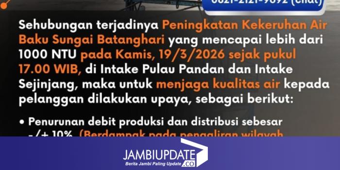 Dari informasi resmi Perumdam Tirta Mayang Kota Jambi, kekeruhan air dilaporkan menembus angka lebih dari 1000 NTU pada Kamis (19/3/2026) sejak pukul 17.00 WIB.