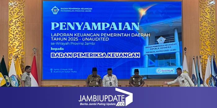 JAMBIUPDATE.CO, JAMBI – Seluruh pemerintah daerah di Provinsi Jambi secara serentak menyerahkan Laporan Keuangan Pemerintah Daerah (LKPD) Tahun Anggaran 2025 kepada Badan Pemeriksa Keuangan (BPK) RI Perwakilan Jambi, Selasa (31/3/2026).